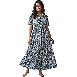 ₹420.00 (as of April 19, 2026 00:38 GMT +05:30 - More infoProduct prices and availability are accurate as of the date/time indicated and are subject to change. Any price and availability information displayed on [relevant Amazon Site(s), as applicable] at the time of purchase will apply to the purchase of this product.)Bollyclues Women’s Crepe Fabric Printed Maxi Dress for Women| Lightweight, Breathable & Flowy | Short Sleeve Button-Down Casual Dress with Waist Tie | Stylish Summer & Vacation Wear